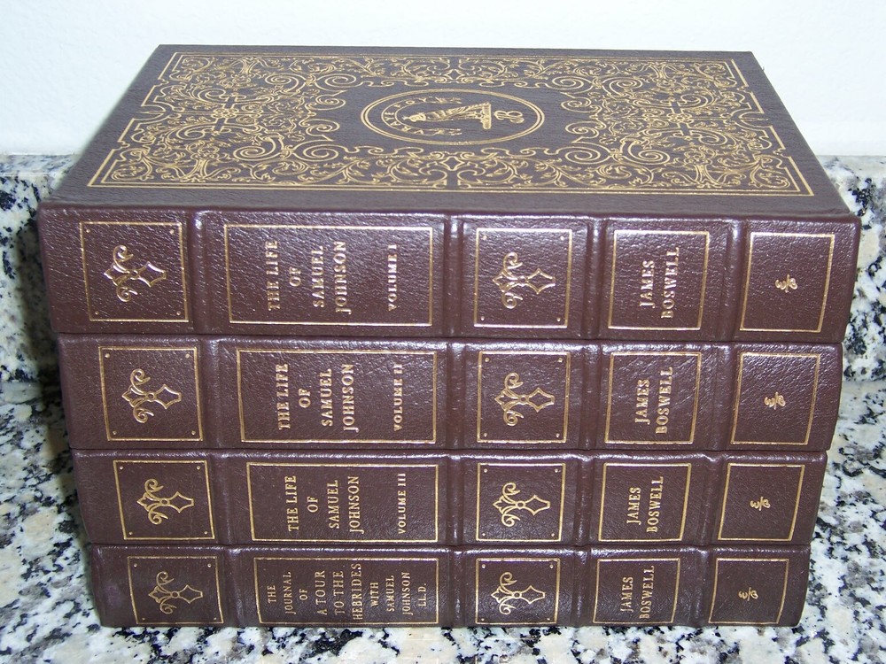 Books from Easton Press Bound in premium leathers, distinctive cover design, hubbed spine accented in 22-karat gold Endsheets of rich moire fabric, permanent satin ribbon page marker Thread sewn pages for strength and durability, gilded page edges for beauty and protection Handsome readable typefaces, beautiful illustrations, archival-quality acid-neutral paper TITLE LIFE OF SAMUEL JOHNSON in 4 vols AUTHOR James Boswell MORE DETAILS with marginal comments and markings from two copies annotated by Hester Lynch Thrale Piozzi Prepared for publication with an introduction by Edward G Fletcher Stamped design on the front, measured by 6 1/4" x 9 1/4"" 1. The Life of Samuel Johnson, I 2. The Life of Samuel Johnson, II 3. The Life of Samuel Johnson, III 4. The Journal of A Tour to the Hebrides with Samuel Johnson LL.D, illustrated with reproductions of contemporary prints by Thomas Rowlandson DESCRIPTION Like new condition, unread, clean inside, tight hardcover binding SHIPPING Books will be packed safely, and shipped via USPS Media Mail with tracking number.