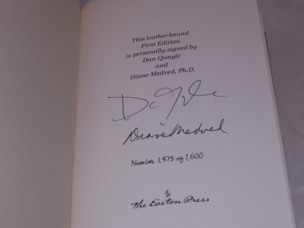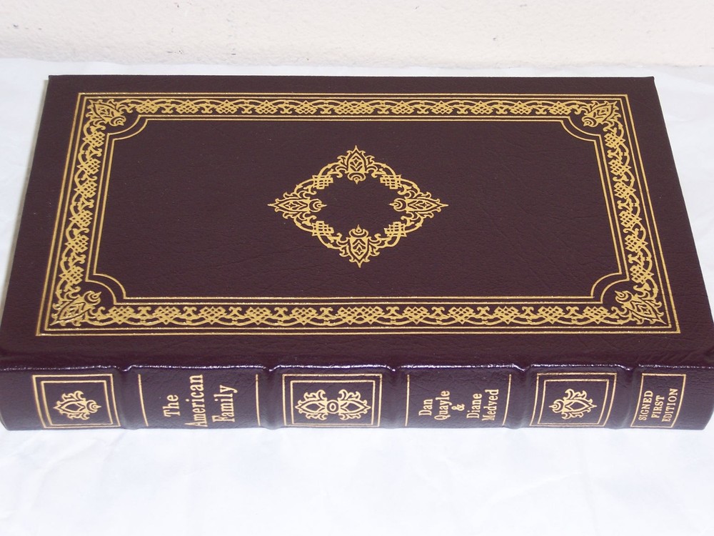 Books from Easton Press Bound in premium leathers, distinctive cover design, hubbed spine accented in 22-karat gold Endsheets of rich moire fabric, permanent satin ribbon page marker Thread sewn pages for strength and durability, gilded page edges for beauty and protection Handsome readable typefaces, beautiful illustrations, archival-quality acid-neutral paper TITLE The American Family: Discovering the Values that make us strong AUTHOR Dan Quayle and Diane Medved MORE DETAILS Signed first edition personally signed by Dan Quayle and Diane Medved, number 1,475 of 1,600 limited copies DESCRIPTION Like new condition, unread, clean inside, tight hardcover binding SHIPPING Books will be packed safely, and shipped via USPS Media Mail with tracking number.