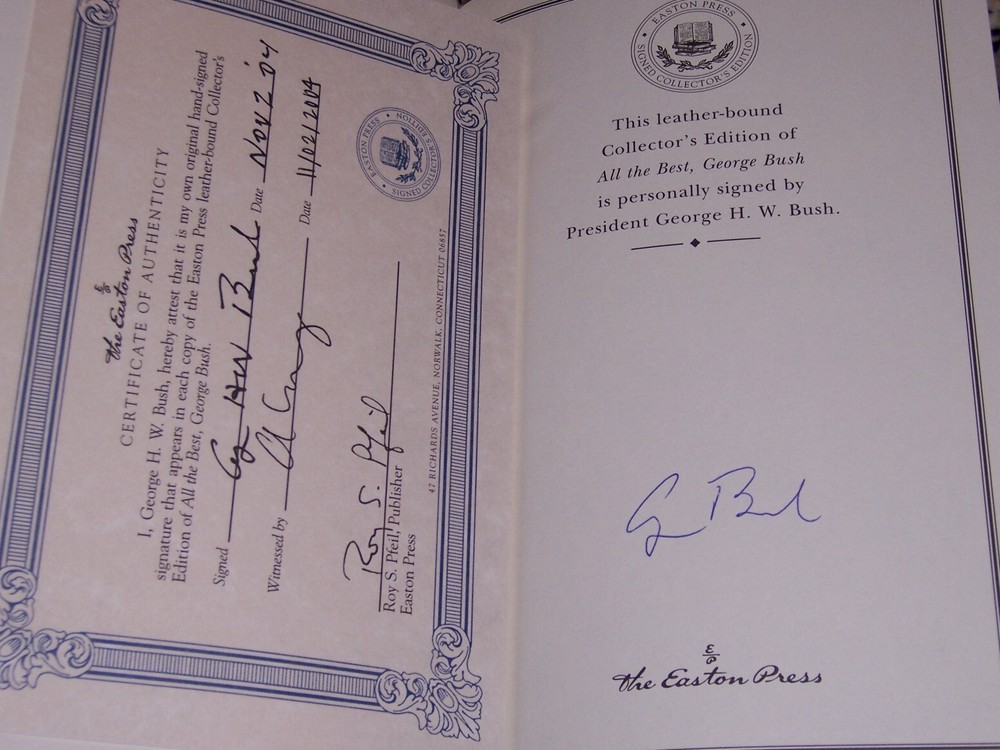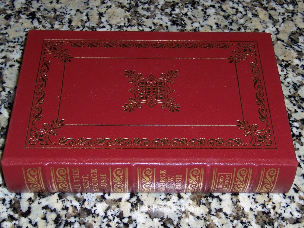 Books from Easton Press Bound in premium leathers, distinctive cover design, hubbed spine accented in 22-karat gold Endsheets of rich moire fabric, permanent satin ribbon page marker Thread sewn pages for strength and durability, gilded page edges for beauty and protection Handsome readable typefaces, beautiful illustrations, archival-quality acid-neutral paper TITLE ALL THE BEST: My life in letters and other writings AUTHOR George H W Bush MORE DETAILS Signed Collector's Edition The Library of the Presidents personally signed by George H W Bush, with certificate of authenticity(COA) DESCRIPTION Like new condition, unread, clean inside, tight hardcover binding SHIPPING Books will be packed safely, and shipped via USPS Media Mail with tracking number.