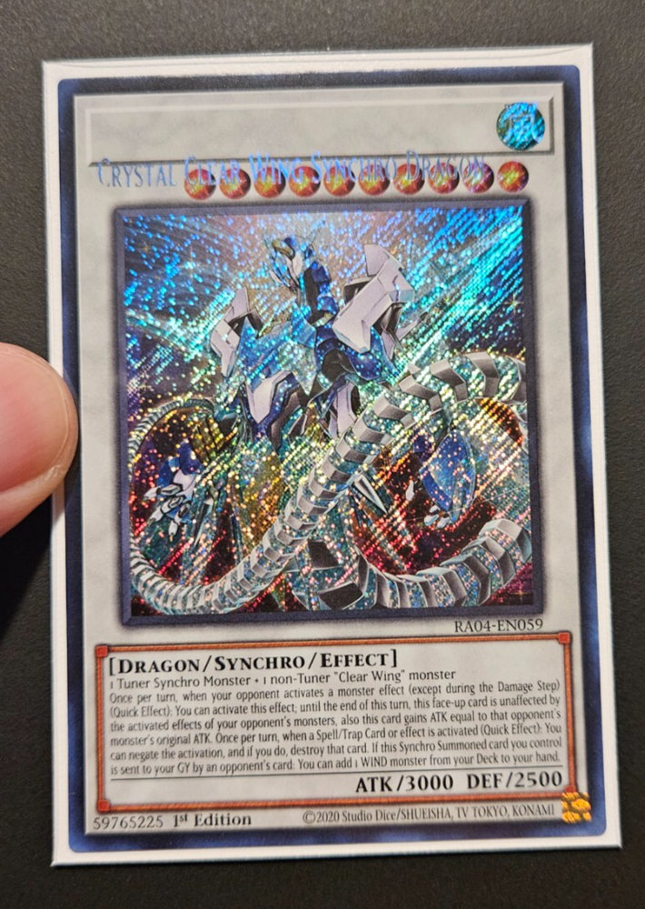 The product is a Yu-Gi-Oh! TCG card from the Quarter Century Stampede set, featuring the Crystal Clear Wing Synchro Dragon with a Wind attribute. This Secret Rare card has a high defense of 2500 and an attack power of 3000, making it a powerful addition to any deck. Manufactured by Konami, this 1st Edition card is an English-language collectible that belongs to the Synchro and Effect card types. With its impressive stats and rarity, this card is a sought-after item for collectors and players alike.