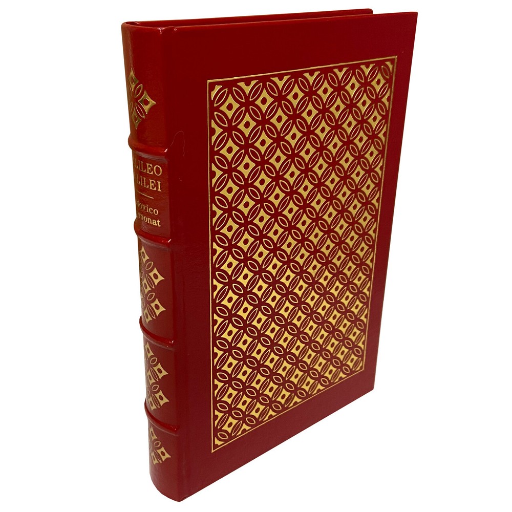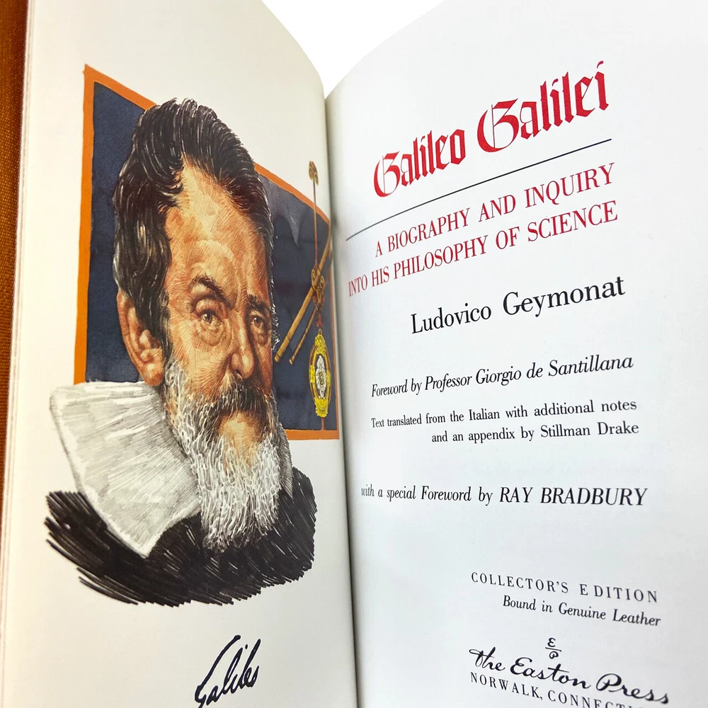 Easton Press, Norwalk CT. Ludovico Geymonat "Galileo Galilei: A Biography and Inquiry Into His Philosophy of Science". Full genuine leather. The library of great lives. Very Fine without any flaws. Forward by Professor Giorgio de Santillana Text translated from the Italian with additional notes and an appendix by Stillman Drake, with a special forward by Ray Bradbury. Galileo Galilei (15 February 1564 - 8 January 1642), often known mononymously as Galileo, was an Italian physicist, mathematician, engineer, astronomer, and philosopher who played a major role in the scientific revolution during the Renaissance. About the author Ludovico Geymonat (May 11, 1908 - November 29, 1991) was an Italian Marxist philosopher, who gave an original turn to dialectical materialism. Ludovico Geymonat teaches medieval art at LSU. His research has developed from doctoral studies on Byzantine and Romanesque wall painting to focus on medieval drawings, monumental programs, and the question of how images and ideas circulated in the Middle Ages. He is currently working on two book projects. The first focuses on wall paintings in the Baptistery of Parma, Italy, and the second, Monumental Decorations and the Medieval Perception of Space, investigates how ideas are translated into visual representations on a monumental scale. Before joining the art history faculty at LSU in 2017, Geymonat was a visiting professor at the University of Notre Dame. He has published on 13th- and 14th-century Venetian painting and sculpture, the Baptistery of Parma, and medieval drawings. His teaching covers the history of medieval art and architecture in Europe and the Mediterranean. Geymonat received his BA in art history from the Universitá di Torino in Turin, Italy, and his MA and PhD in art history from Princeton University. Features Includes all the classic Easton Press qualities: * Premium Leather * Silk Moire Endleaves * Distinctive Cover Design * Hubbed Spine, Accented in Real 22KT Gold * Satin Ribbon Page Marker * Gilded Page Edges * Long-lasting, High Quality Acid-neutral Paper * Smyth-sewn Pages for Strength and Durability * Beautiful Illustrations Galileo Galilei Galileo di Vincenzo Bonaiuti de' Galilei (15 February 1564 – 8 January 1642), commonly referred to as Galileo, was an Italian astronomer, physicist and engineer, sometimes described as a polymath, from the city of Pisa, then part of the Duchy of Florence.[4] Galileo has been called the "father" of observational astronomy, modern physics, the scientific method, and modern science. Galileo studied speed and velocity, gravity and free fall, the principle of relativity, inertia, projectile motion and also worked in applied science and technology, describing the properties of pendulums and "hydrostatic balances". He invented the thermoscope and various military compasses, and used the telescope for scientific observations of celestial objects. His contributions to observational astronomy include telescopic confirmation of the phases of Venus, observation of the four largest satellites of Jupiter, observation of Saturn's rings, and analysis of lunar craters and sunspots. Galileo's championing of Copernican heliocentrism (Earth rotating daily and revolving around the sun) was met with opposition from within the Catholic Church and from some astronomers. The matter was investigated by the Roman Inquisition in 1615, which concluded that heliocentrism was foolish, absurd, and heretical since it contradicted Holy Scripture. Galileo later defended his views in Dialogue Concerning the Two Chief World Systems (1632), which appeared to attack Pope Urban VIII and thus alienated both the Pope and the Jesuits, who had both supported Galileo up until this point. He was tried by the Inquisition, found "vehemently suspect of heresy", and forced to recant. He spent the rest of his life under house arrest. During this time, he wrote Two New Sciences (1638), primarily concerning kinematics and the strength of materials, summarizing work he had done around forty years earlier.