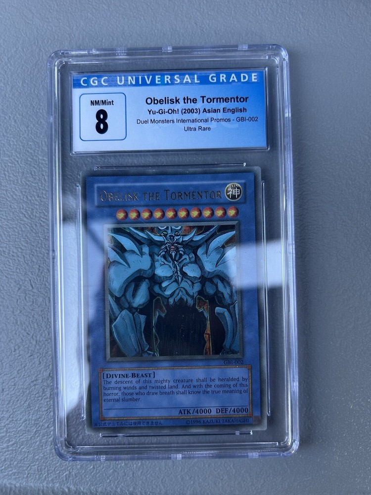 This highly collectible card features the iconic Obelisk The Tormentor, a must-have for any fan of the game. The card is graded CGC 8, ensuring its authenticity and quality. Perfect for adding to your collection or for use in competitive play, this card is a valuable addition to any deck. With its striking artwork and powerful abilities, Obelisk The Tormentor is a fearsome opponent in any battle. Whether you're a seasoned player or just starting out, this card is sure to impress. Don't miss your chance to add this rare and sought-after card to your collection today.