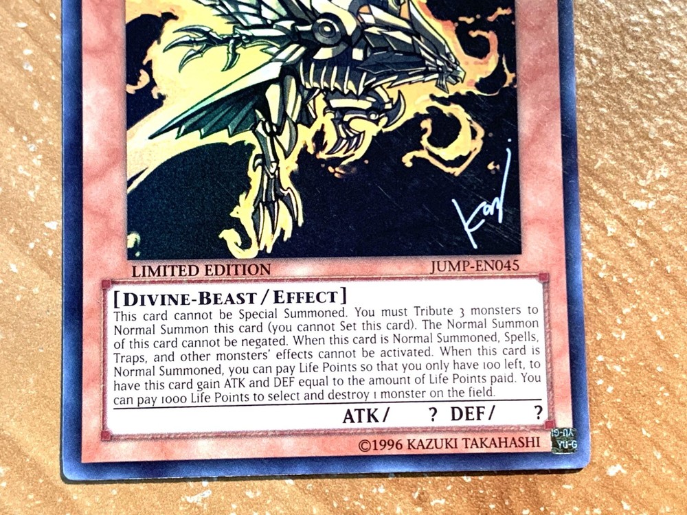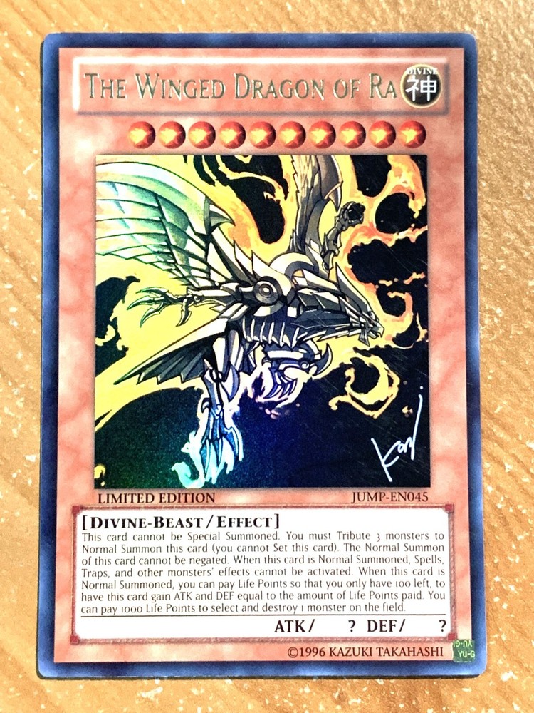 This auction is for (1x) one of the card listed in the title, in the condition listed in the title The Winged Dragon Of Ra JUMP EN045 Limited Edition Ultra Rare new card near mint If the condition is not specified the items will be in mint/near mint condition See our grading scale for details. FOR TRADING CARDS: CONDITION INFORMATION v Near Mint (NM) – Card will be Mint or very close to it. v Lightly Played (LP) – Card will have edge wear and/or small dents, but no major creases. v Moderately Played/Played (MP/P) – Card will have visible creases, dents and/or edge wear. v Heavily Played (HP) – Card will noticeable damage such as large creases and/or heavy edge wear. v Damaged (Da) - Card will be in very played condition, heavy edgewear, large creases, entire card may be played. SHIPPING INFORMATION Ø Your items will be shipped out within 24 hours of purchase on BUSINESS DAYS ONLY . This excludes Saturdays, Sundays, and US Holidays. Please allow 2-9 business days for USPS to deliver your items Ø Please add all items to your cart prior to checkout to ensure your items are mailed together. Ø VERY IMPORTANT - PLEASE READ!!! Check your shipping address prior to check out to be sure that we are sending it to the correct address!!! Please be sure to include apartment or unit #’s when applicable. · A PLAYMAT will be shipped in a cardboard tube and tracking information will be included. Multiple playmats will be shipped in a large bubble mailer. · SLEEVES will be shipped in a bubble mailer and tracking information will be included. · CARDS will be placed into a top loader and a sleeve during shipping for protection. Purchases over $15 will have tracking information, free of charge. · FULL DECKS will be sleeved, placed in a deck box, and shipped in a bubble mailer. Tracking will be included. WE SHIP INTERNATIONALLY!!! International Buyers - Please Note: Import duties, taxes, and charges are not included in the item price or shipping cost. These charges are the buyer's responsibility. Please check with your country's customs office to determine what these additional costs will be prior to bidding or buying. · Excludes South America – NO EXCEPTIONS · We will not claim less than the value of what you purchase, so please do not ask. · We ship via the Global Shipping program. Shipping charges are created by eBay and received by their third party shipping department, therefore we do not have any control over the prices. o Includes tracking information (even outside the U.S.). o Insurance for package is also included. FEEL SAFE WHEN SHOPPING WITH US THANK YOU FOR SHOPPING WITH US, PLEASE CHECK OUT OUR OTHER ITEMS FOR MORE GREAT DEALS!