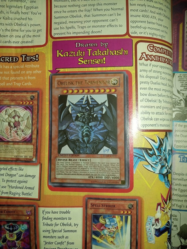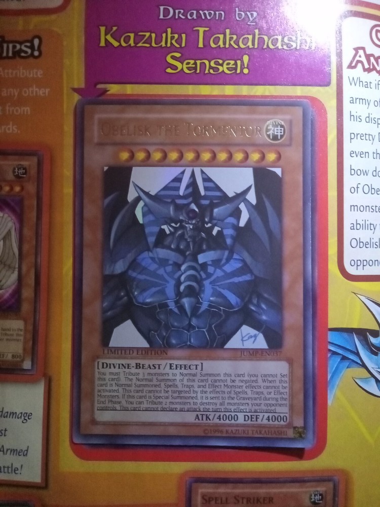 This Yu-Gi-Oh! card is a true gem for collectors. It features the powerful Divine-Beast monster Obelisk The Tormentor in Ultra Rare rarity, with a stunning Holo finish. As a Limited Edition card with card number jump-en037, it is a valuable addition to any collection. The card is in excellent shape, with Attribute/MTG:Color of Divine. Its Card Type is Effect, and it belongs to the Game Yu-Gi-Oh! TCG. The Creature/Monster Type is also Divine-Beast. This card is sure to make an impact on any duel, and is a must-have for any serious collector. Comes still intact to the original Shonen Jump Jan 2010 issue #1