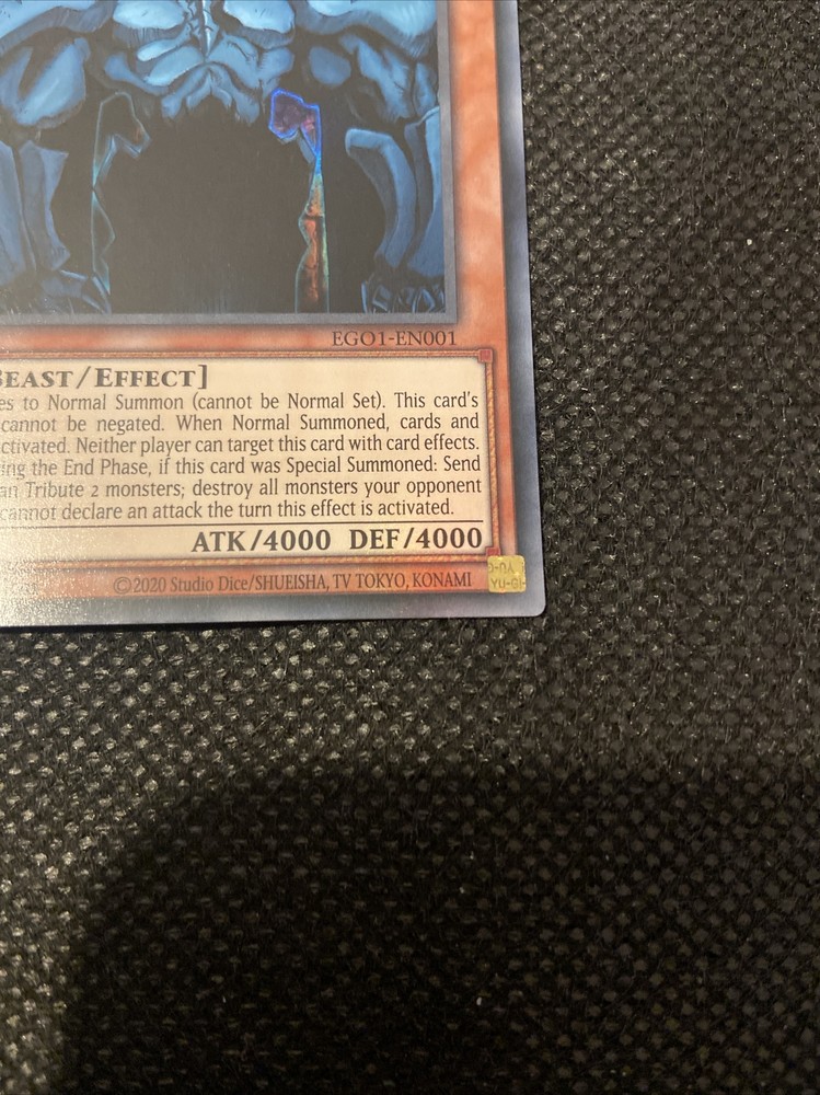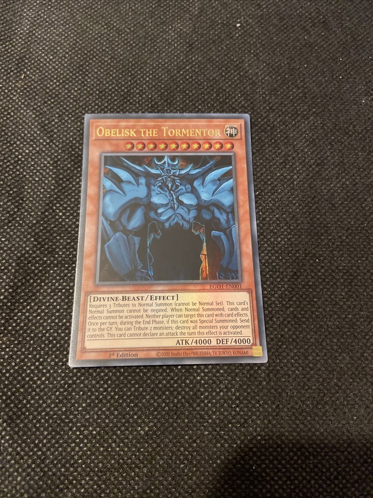 This listing is for 1x Yu-Gi-Oh Obelisk the Tormentor EGO1 EN001 card in NM/M condition This card will be sent out in a penny sleeve and a top loader to increase protection from any potential damage via shipping. If you have any questions regarding this listing then please feel free to send me a message, also please have a look at my other listings :)